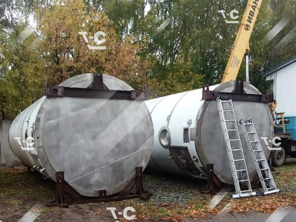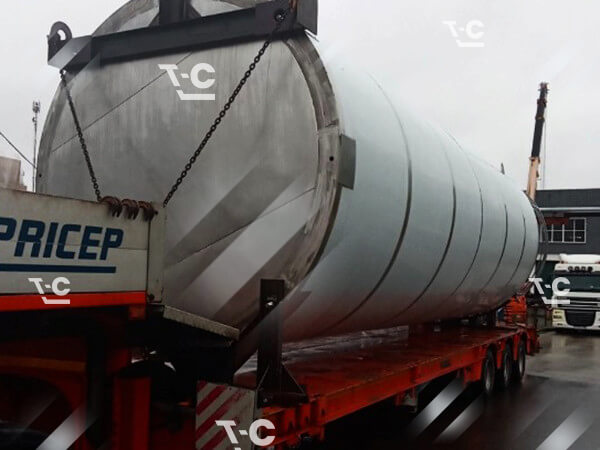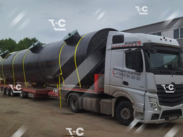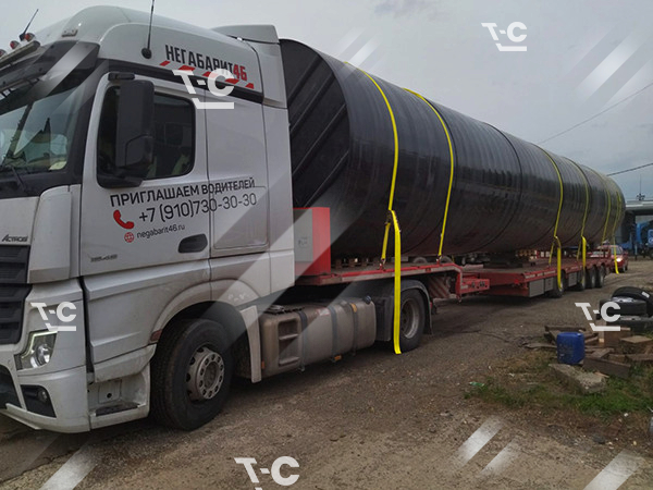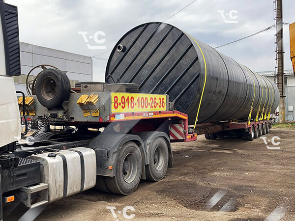 Перевозка ёмкости на трале — предмета, круглого в поперечном сечении — требует принятия особых мер для надёжного крепления негабаритного груза. В простых случаях подкладываем под цистерны бруски и используем систему строп. При более сложных перевозках негабарита применяем специальные ложементы.